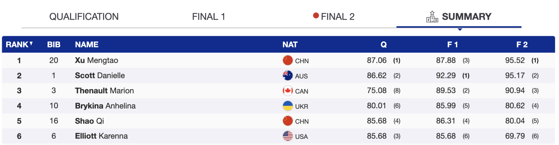 北京时间19日的个人决赛分两轮进行,首轮排名前6位的选手进入到第二轮决赛。普莱德西湖当天大雪纷飞,能见度欠佳,很多选手都选择了难度系数较低的动作。但徐梦桃在第二轮依旧选择去拼,大赛经验丰富的她选择了难度系数3.525的动作,领先完成同样动作的澳大利亚选手丹妮尔·斯科特0.35分获得冠军。加拿大选手玛丽昂·泰诺得到铜牌。中国选手邵琪排名第五。